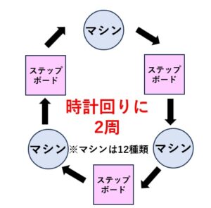 12台の筋トレマシンが円形状に並べてあり、マシンとマシンの間にはステップボードが置かれています。(下図参照)