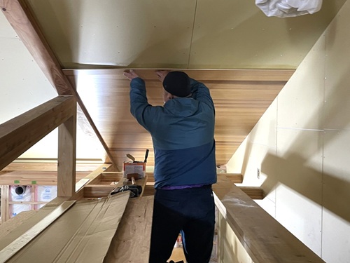 天井化粧板の貼り付けも始まりましたよ❗
