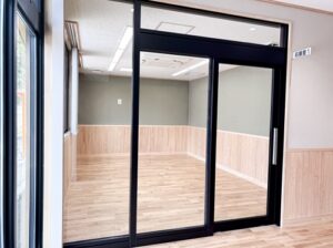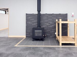 事務所内の黒いタイルが敷かれているところは、薪ストーブを設置する場所なんですよ👆