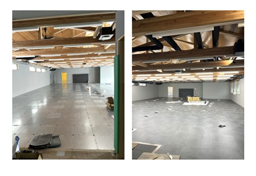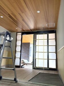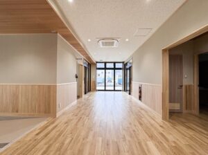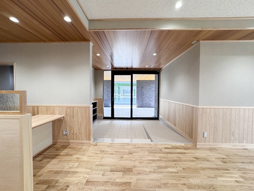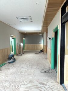 玄関のタイル張りが進み、廊下の床材も敷かれて、事務所内も配線工事や床張りが進み、完成が近付いていることを感じられました。